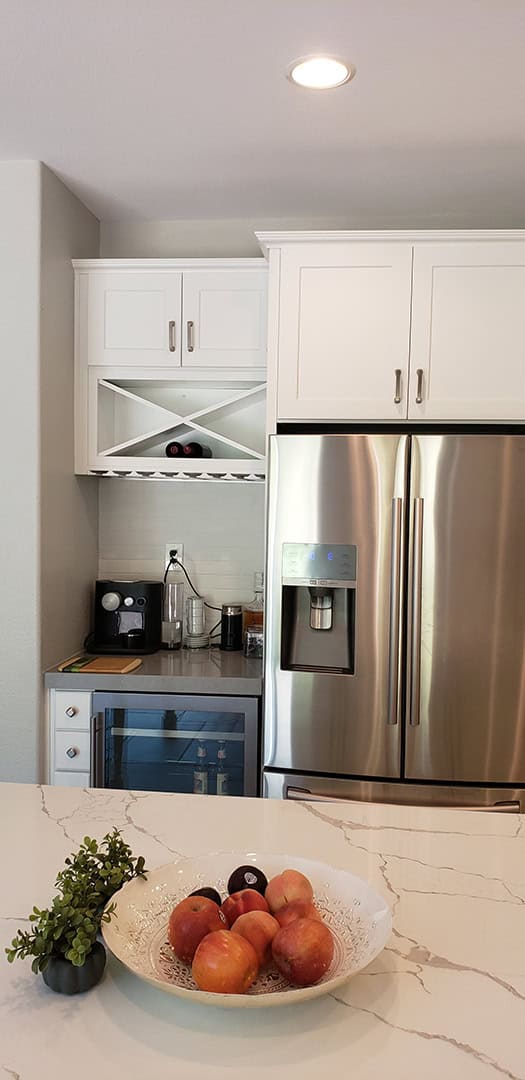 This kitchen renovation transforms the space into a bright and inviting hub of the home. Crisp white cabinetry is complemented by soft gray elements, creating a balanced and contemporary palette. The centerpiece is a beautifully crafted fireplace with a stone veneer that adds warmth and rustic character without sacrificing modern elegance. Thoughtful design details and smart storage solutions enhance both style and functionality, resulting in a kitchen that is as practical as it is visually striking.