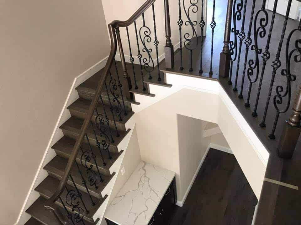 The kitchen continues the theme with a beautifully crafted marble countertop that elevates the room’s clean, modern lines. Functional design meets aesthetic clarity, creating an inviting space for both cooking and gathering. The staircase has also undergone a sophisticated upgrade: dark wenge steps contrast elegantly with bright white walls, producing a sharp architectural statement that ties the entire interior together. Every element—from textures to color balance—works in harmony to achieve a home that feels polished, contemporary, and thoughtfully curated.
