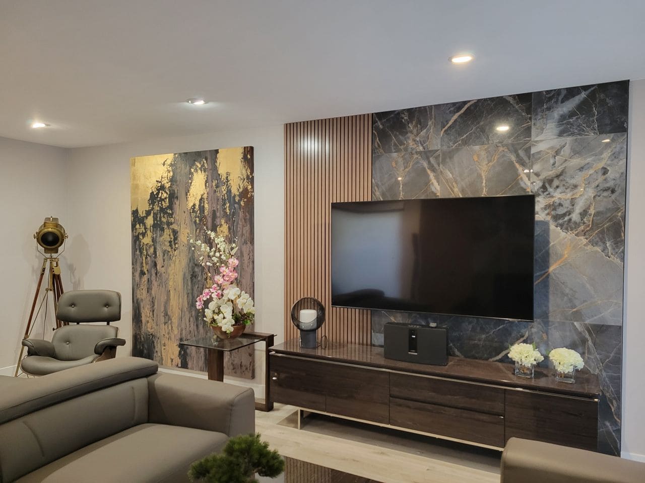 This home transformation introduces a contemporary, airy atmosphere through a harmonious balance of pale surfaces, rich dark accents, and subtle lighting. The living area feels spacious and inviting, while carefully placed dark furniture and décor add depth and sophistication. The staircase becomes a striking centerpiece, with dark steps contrasted against bright walls and highlighted by integrated lighting, creating both drama and elegance. In the kitchen and bathrooms, clean lines and minimalistic forms preserve the sense of openness, while dark details punctuate the spaces, adding character and contrast. Every element—from materials to lighting and color harmony—is thoughtfully curated to achieve a modern, balanced, and inviting interior.