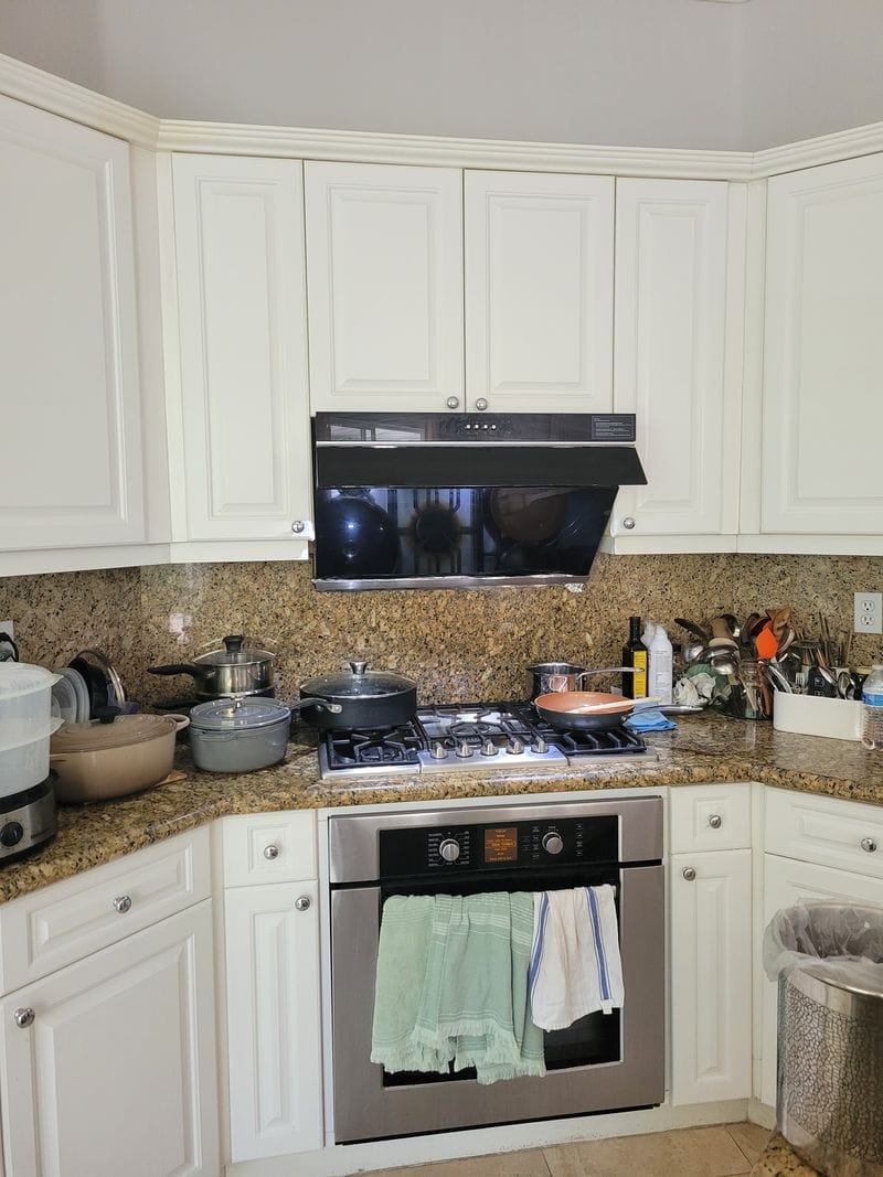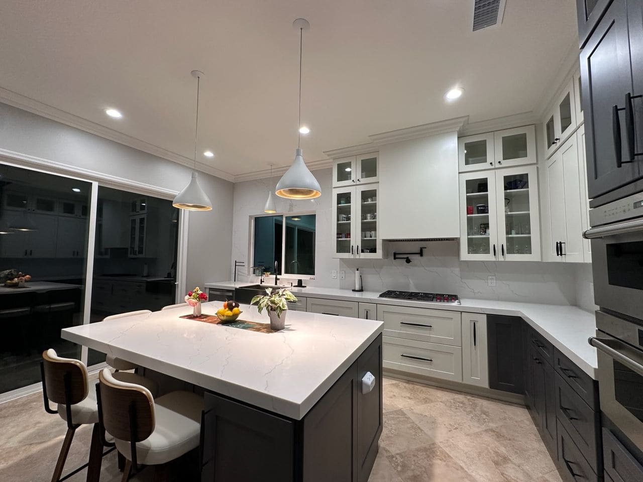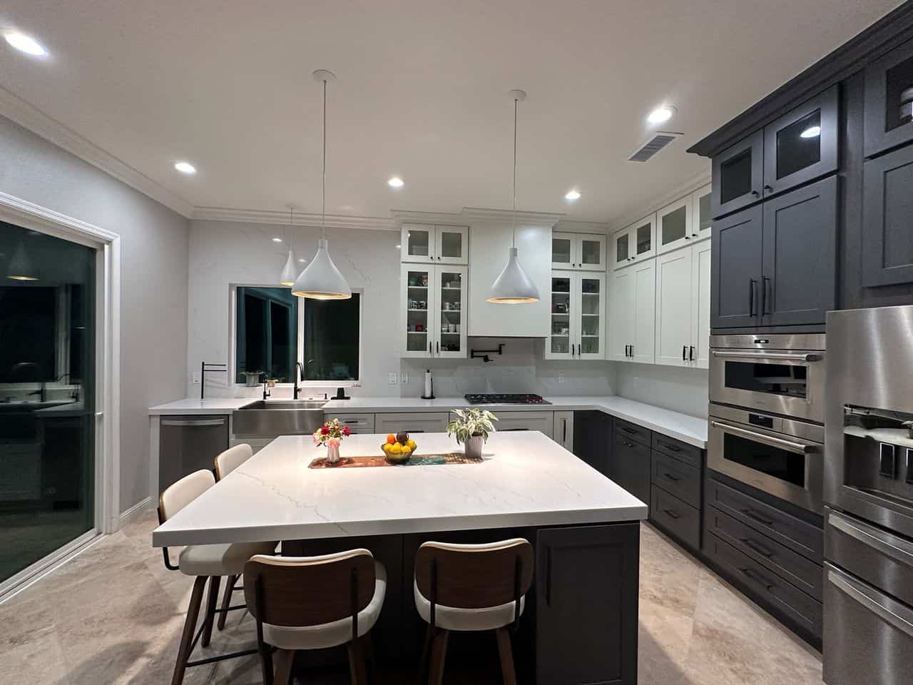 This kitchen transformation reimagines a previously all-white, airy interior into a bold yet balanced composition of white and deep graphite tones. The new design introduces a striking marble-inspired countertop and backsplash in crisp white, replacing the former sand-toned stone textures with a cleaner, more contemporary aesthetic. At the heart of the space, a central island creates both a visual anchor and a functional hub, enhancing flow and usability. Dark gray cabinetry adds depth and sophistication, contrasting elegantly with bright surfaces to achieve a harmonious interplay of light and shadow. The result is a kitchen that feels modern, structured, and inviting—where minimalism meets strong visual character through thoughtful material and color choices.